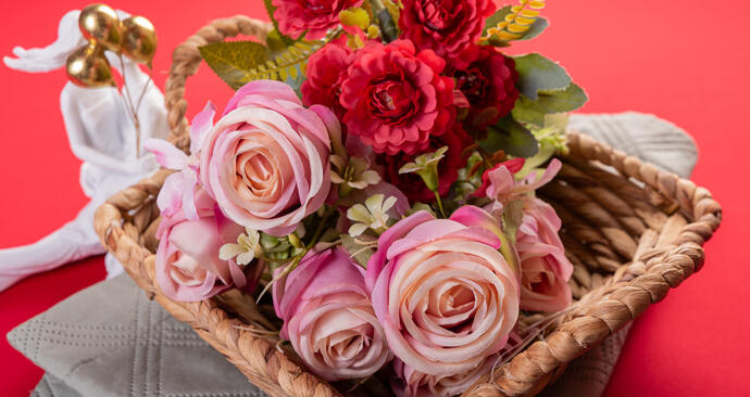Cream and white roses, a heart shaped box of toffee coffee chocolates, cedar & patchouli perfume, and a bottle of cream sherry. Elegant and romantic.