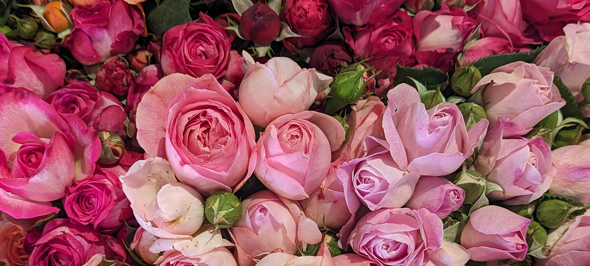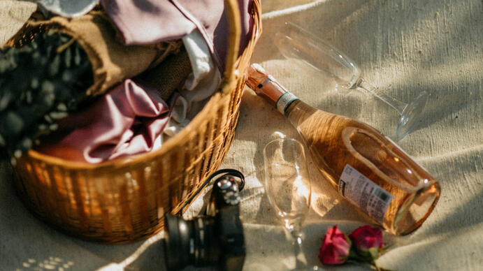 Pink and white roses with delphinium in a Queen Mandragora pot, white chocolate truffles, jasmine & gardenia perfume, and a bottle of sparkling rosé. Charmingly sweet.